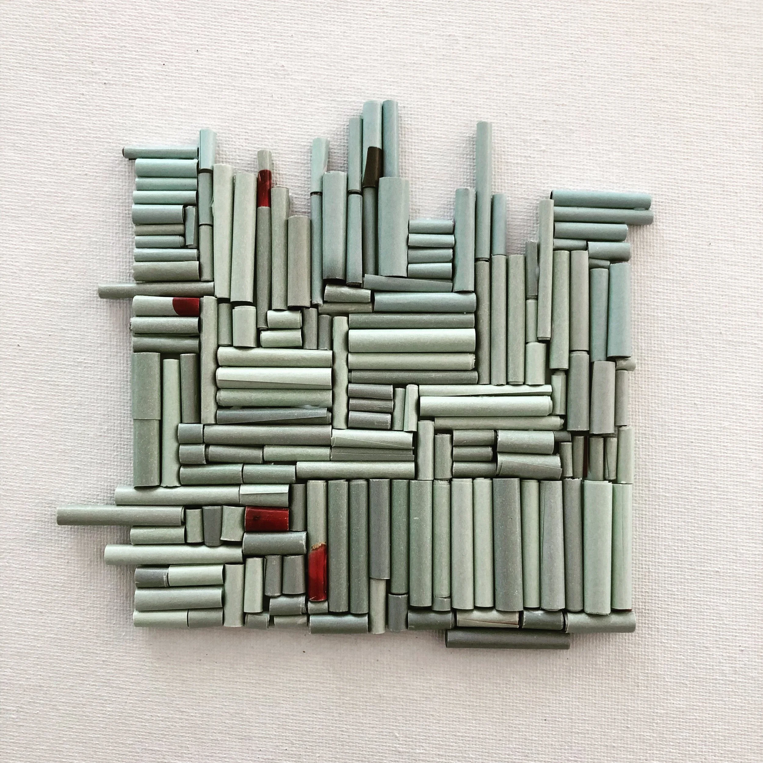 Magazine paper cylinders on canvas, 5 in x 4.5 in x .25 in, 2019